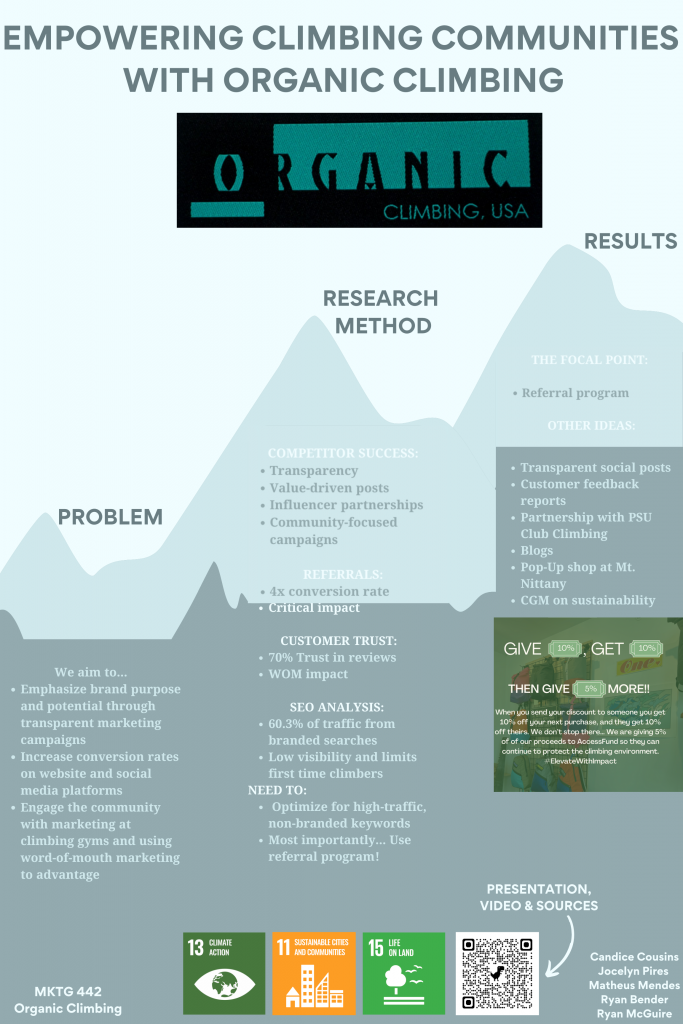 This was an extremely valuable class for me. We did a semester long sustainability marketing analysis and created a strategy for a company called Organic Climbing, USA. We created a comprehensive campaign and presented to the CEO along with our professor.